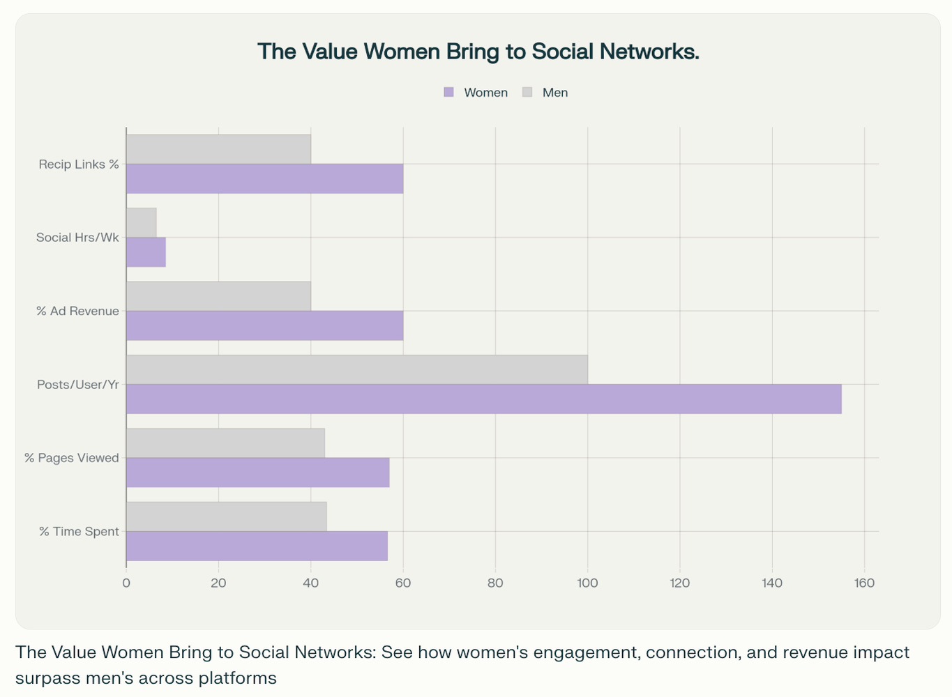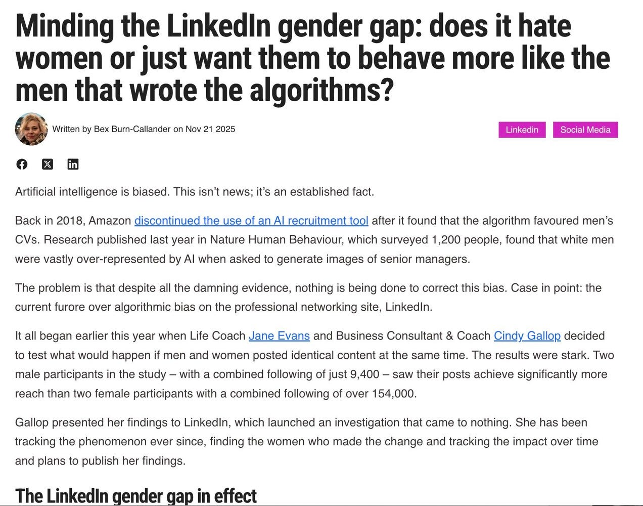Cindy Gallop documented reaching 801 people (0.6 percent of her followers) while a male colleague posting identical content reached 10,408 people (143 percent of his followers).