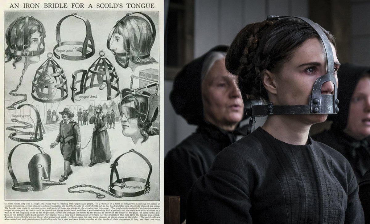 Scold’s bridle (metal cage locked on head preventing speech)