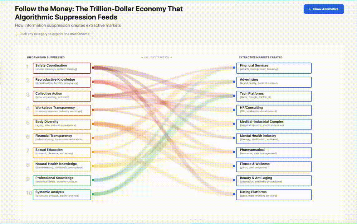 What you’re seeing: Ten categories of women’s knowledge—from trauma warnings to financial literacy—systematically suppressed across platforms. Follow each colored flow from left to right to see which industries profit from that specific suppression. The thicker the flow, the more revenue depends on keeping women from coordinating that knowledge. Click any category to see exactly how the extraction works.